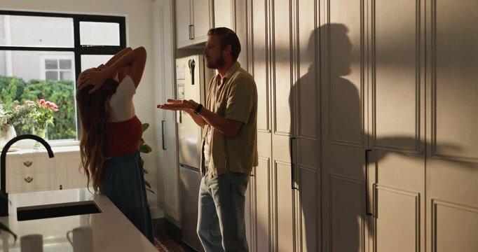 Divorce, conflict and couple with argument in kitchen for toxic marriage, betrayal and blame. Fight, liar and frustrated people with conversation, relationship drama and break up for cheating affair