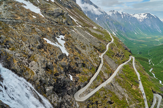 AERIAL: Cars driving along scenic mountain highway with sharp hairpin turns