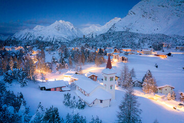 Dusk over Chiesa Bianca and Maloja village covered with snow, Bregaglia, Engadine, Graubunden Canton, Switzerland, Europe