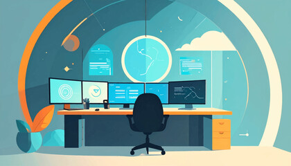 A modern stylized home office interior, with a curved arch, multiple monitors, and a swivel chair