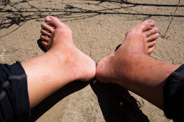 The right ankle becomes severely swollen after numerous mosquito and gnat bites on the sandy shores of the Amur river in far East Russia.