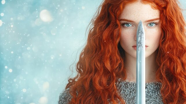 Close-up of a determined redhead woman with freckles, holding a sword upright, exuding strength and intensity in a modern setting.