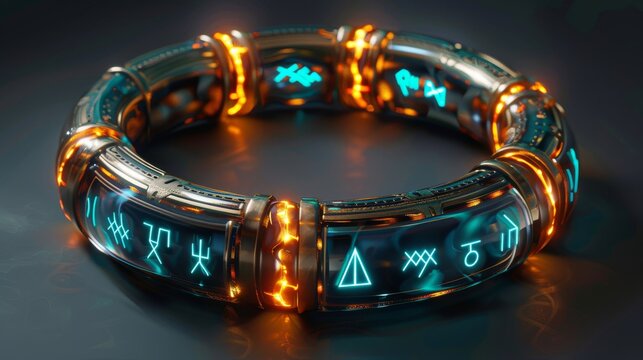 A glowing blue and orange alien artifact with strange symbols