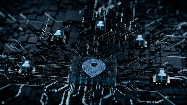 Location Technology Concept with map pin symbol on a Microchip. White Neon Data flows between Users and the CPU across a Futuristic Motherboard. 3D render.