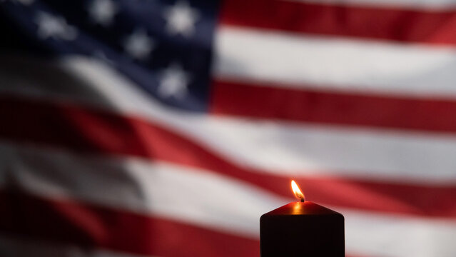 Burning candle against the background of the waving flag of the united states of america in the dark.