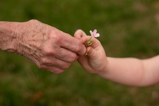 Closeup of grandmother's hand and child's hand sharing a flower blossom