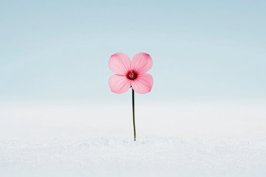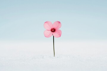 Pink flower blooming in a snowy landscape, symbolizing resilience and contrast between delicate nature and harsh surroundings. The scene highlights beauty and simplicity in a cold environment.