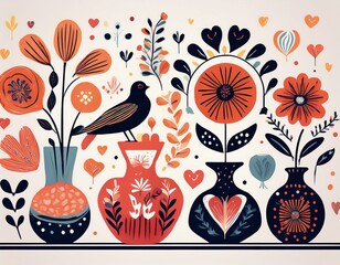 hand drawn whimsical folk style flower vases with symbolic motifs abstract shapes decorative birds hearts modern naive composition