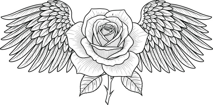 Rose with wings tattoo design, black and white line art flower illustration, symbolic beauty freedom transformation, detailed floral graphic artwork
