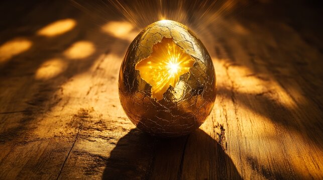Brilliantly polished golden egg nestled on rich walnut table surface, dramatic moment of cracking with ethereal rays of warm light bursting from within, symbolic financial imagery, studio lighting
