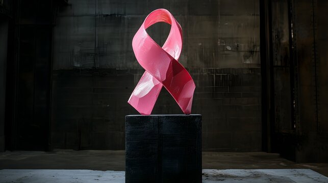 Powerful and emotive pink ribbon sculpture set against a shadowy industrial style environment conveying strength and resilience in the face of breast cancer