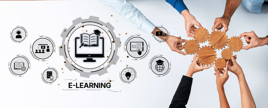 Engaging teamwork in e-learning demonstrates modern educational methods. Hands working together around a computer symbolize collaboration and innovation in digital learning. Trope