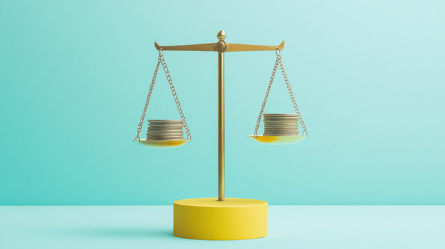 golden scale balances stacks of coins both sides, symbolizing financial equilibrium and economic stability. vibrant yellow base contrasts with serene turquoise background, creating visually