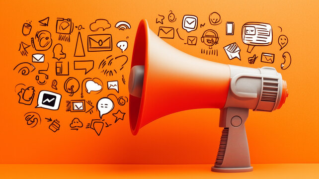 Dynamic megaphone projecting vibrant speech bubbles symbolizing the power of communication branding and messaging against a clean neutral background