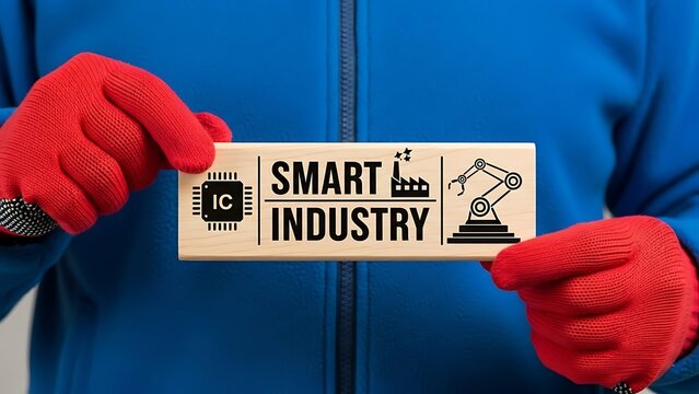 Skilled worker in vibrant gloves presents a wooden block symbolizing smart industry concepts like robotics and microchips for manufacturing