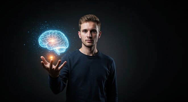 Mind over Matter: A man stands confidently, his gaze fixed as he holds a glowing representation of the brain, symbolizing the power of thought and intellect.