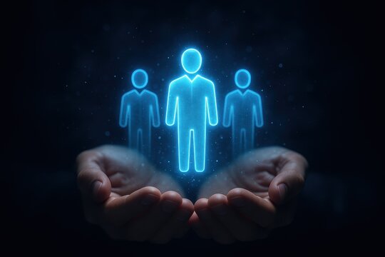 Glowing hologram people above hands symbolizing leadership teamwork and digital vision
