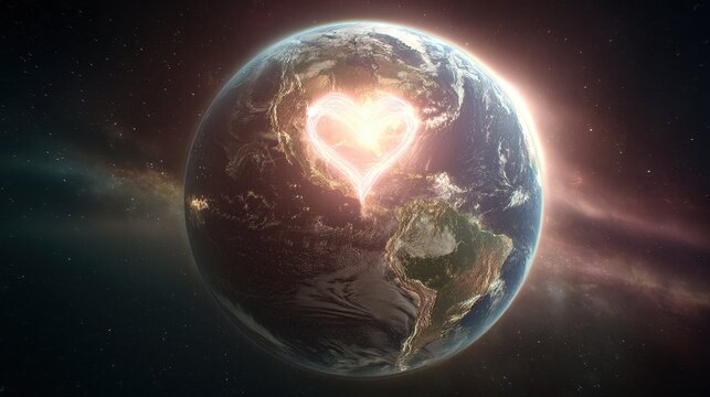 Earth with a glowing heart-shaped area, symbolizing love for the planet and unity, set against a backdrop of stars in the cosmos.