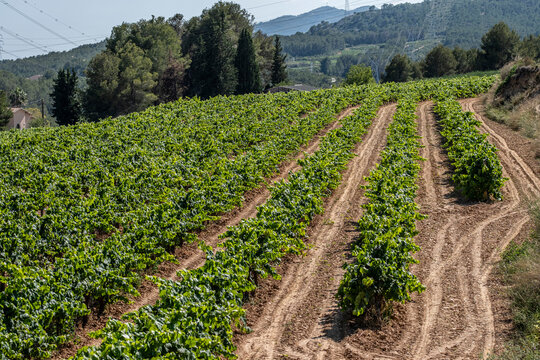 Neatly arranged rows of green vineyards stretch out under a bright blue sky, symbolizing growth and vitality within a meticulously cultivated agricultural landscape.