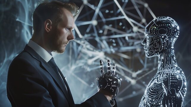 Businessman showing technology smart robot AI technology Ai tech Artificial Intelligence artificial intelligence by enter command prompt for generates Futuristic technology transformat : Generative AI