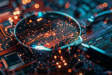 A magnifying glass examining network components, symbolizing the investigation of network issues