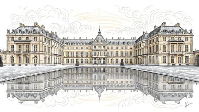 Digital Illustration of the Palace of Fontainebleau Reflecting in a Pool, Showing Symmetry and Grand Architecture, Suitable for Travel, History, or Art-Related Projects, with Artistic Clouds