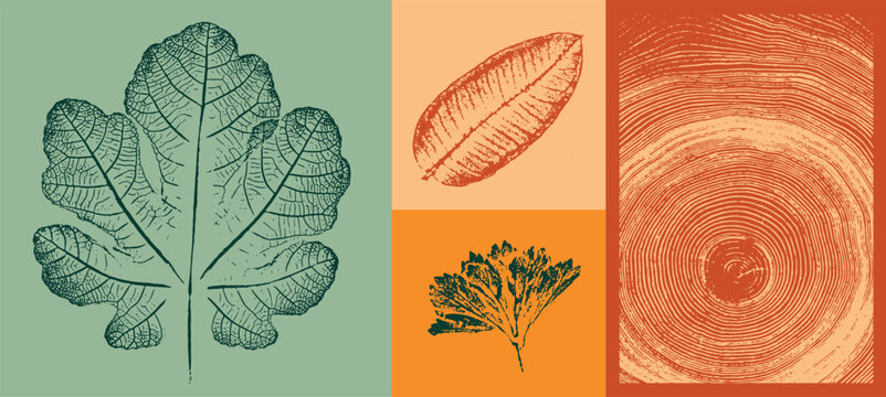 Set of colorful isolated autumn leaves. Grunge foliage stamps of oak maple and sycamore leaves. Tree rings design.