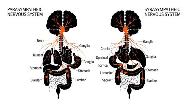 artistic illustration depicts autonomic nervous system showcasing sympathetic and parasympathetic pathways vibrant colors blending accuracy creativity educational use.