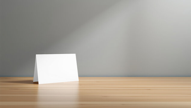 Transparent a blank white greeting card standing on a wooden table with sunlight casting a shadow on the wall mockup