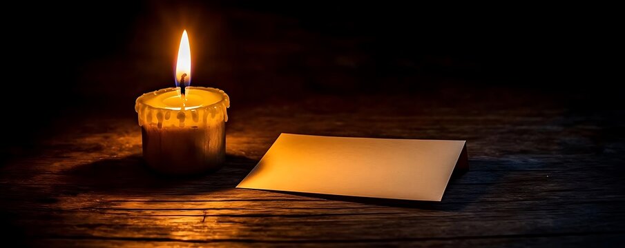Lit candle, blank note, wood