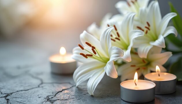 Lit candle surrounded by blossoms, remembrance, peaceful scene, sympathy card