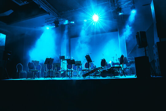 Musical instruments of symphonic orchestra and music stands for music on the concert stage