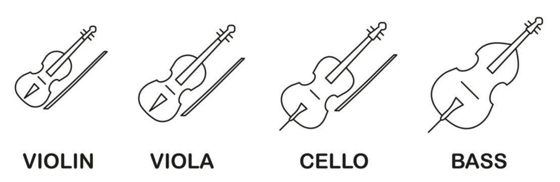 Set of symphonic string musical instruments. Set of stringed instruments with title in thin line.