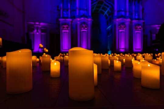 Professional symphonic string orchestra performing on stage and playing a classical music concert, violinist in a foreground