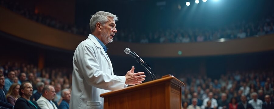 Doctor in white coat addresses crowd from podium with microphone at medical conference. Man gives presentation to attentive audience in auditorium hall. Healthcare professionals attend event.