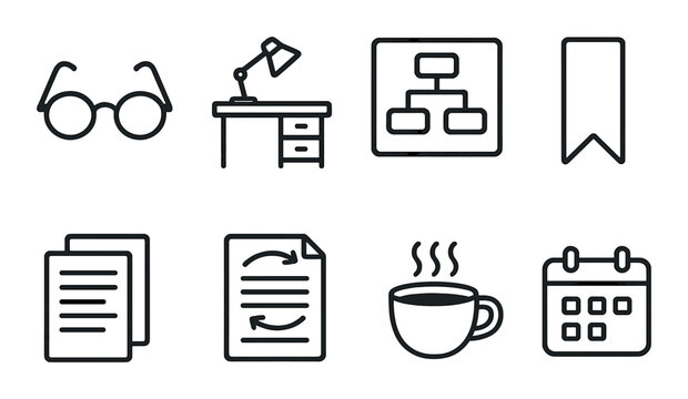 Vector line icons: glasses, desk lamp, flowchart, bookmark, documents, refresh, coffee, calendar