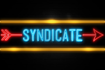 Syndicate  - fluorescent Neon Sign on brickwall Front view