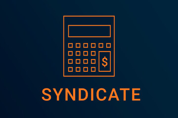 syndicate  text. Calculator symbolizes economy. syndicate  logo on dark background. Illustration syndicate . Financial screensaver. Minimalist orange calculator