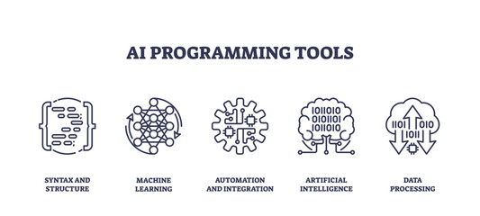 Outline icons set depicting AI programming tools including syntax and structure, machine learning, automation and integration, artificial intelligence, and data processing, transparent background.