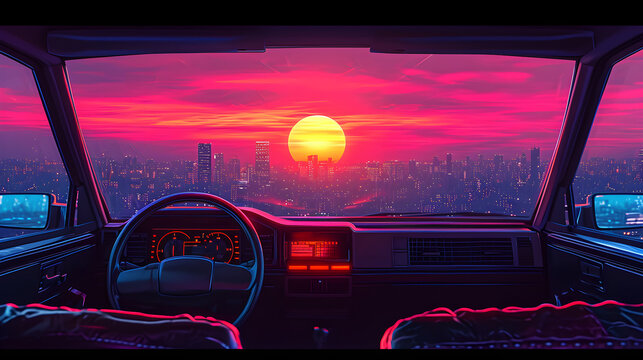 80s retro illustration of a car driving with sunset view, exuding synthwave 80s vibes.