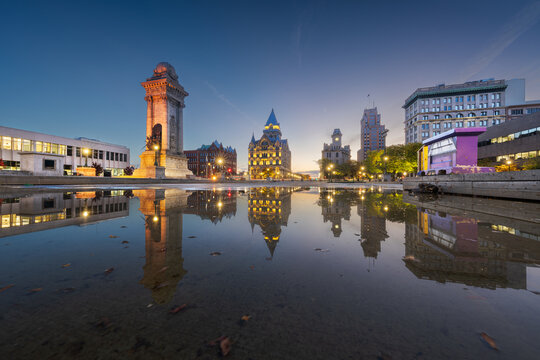 Downtown Syracuse New York with view of historic buildings and fountain at Clinton Square