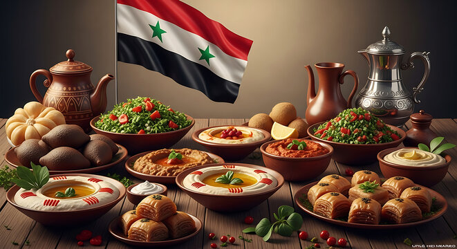 Hyper-Realistic Syrian Traditional Cuisine with Syrian Flag – Premium Middle Eastern Food Photography