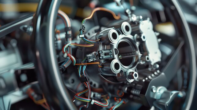 A tightly framed shot of the intricate circuitry and connectors of a battery management system focusing on the tiny components such as capacitors and resistors that regulate the charge
