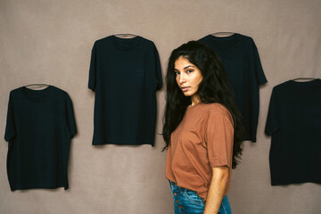 Side view of ethnic female in casual outfit standing in studio with t shirts on wall and looking at camera