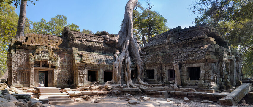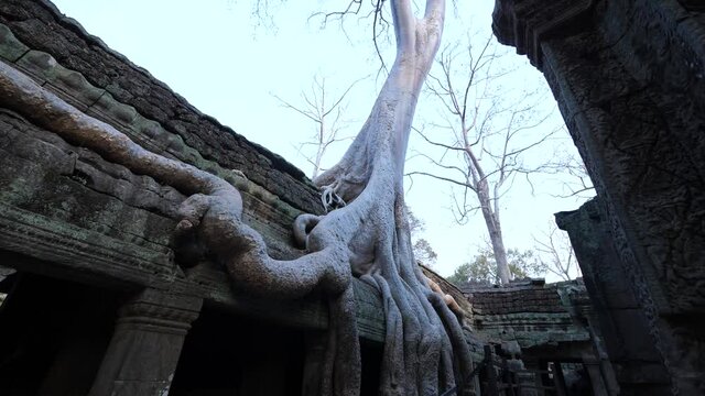 Ta Phrom - Iconic 12th century Angkor Khmer Temple with Tree roots intertwined with the temple structure, famous for Tomb Raider movie featuring Angeline Jolie at Siem Reap, Cambodia, Asia