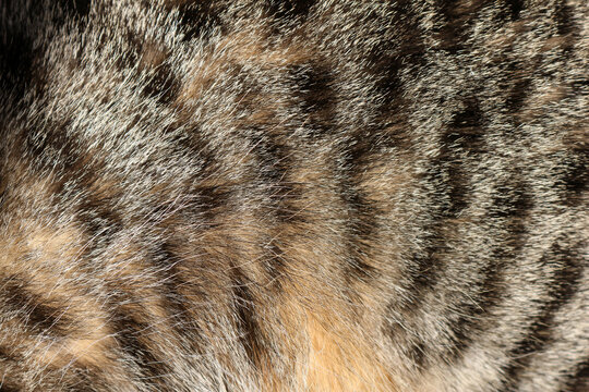 tabby white domestic shorthair cat portrait looking curiously at camera on brown background