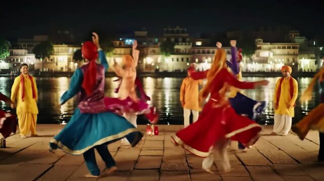 Couples in bright saris and white dhotis dance along Vrindavan streets at sunset, tabla beats and flute melodies filling the lively atmosphere