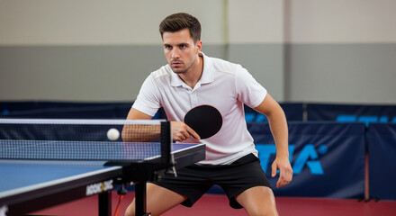 Professional man playing table tennis in a focused stance, mid-game, ready to hit the ball