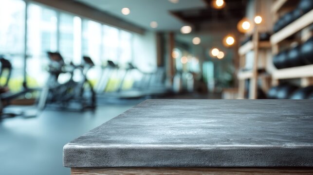 Concrete tabletop surface with blurred modern gym interior background