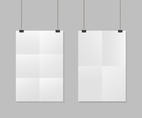 Paper sheet with fold. White poster with clip. Mockup a4 with shadow. Blank vertical mock with clamp. Realistic template for newspaper, newsprint, tabloid and media. Brochure with rope. Vector
